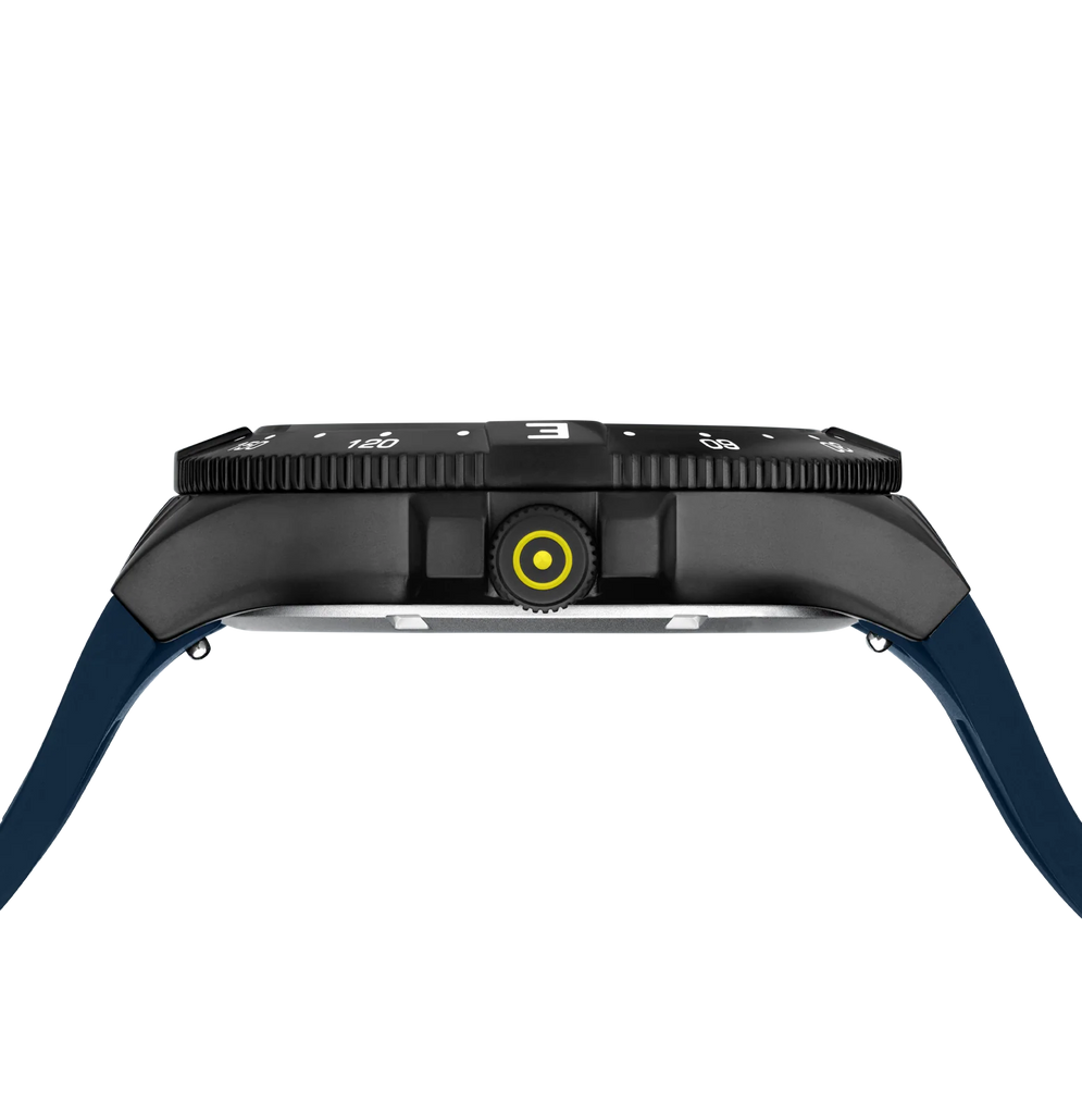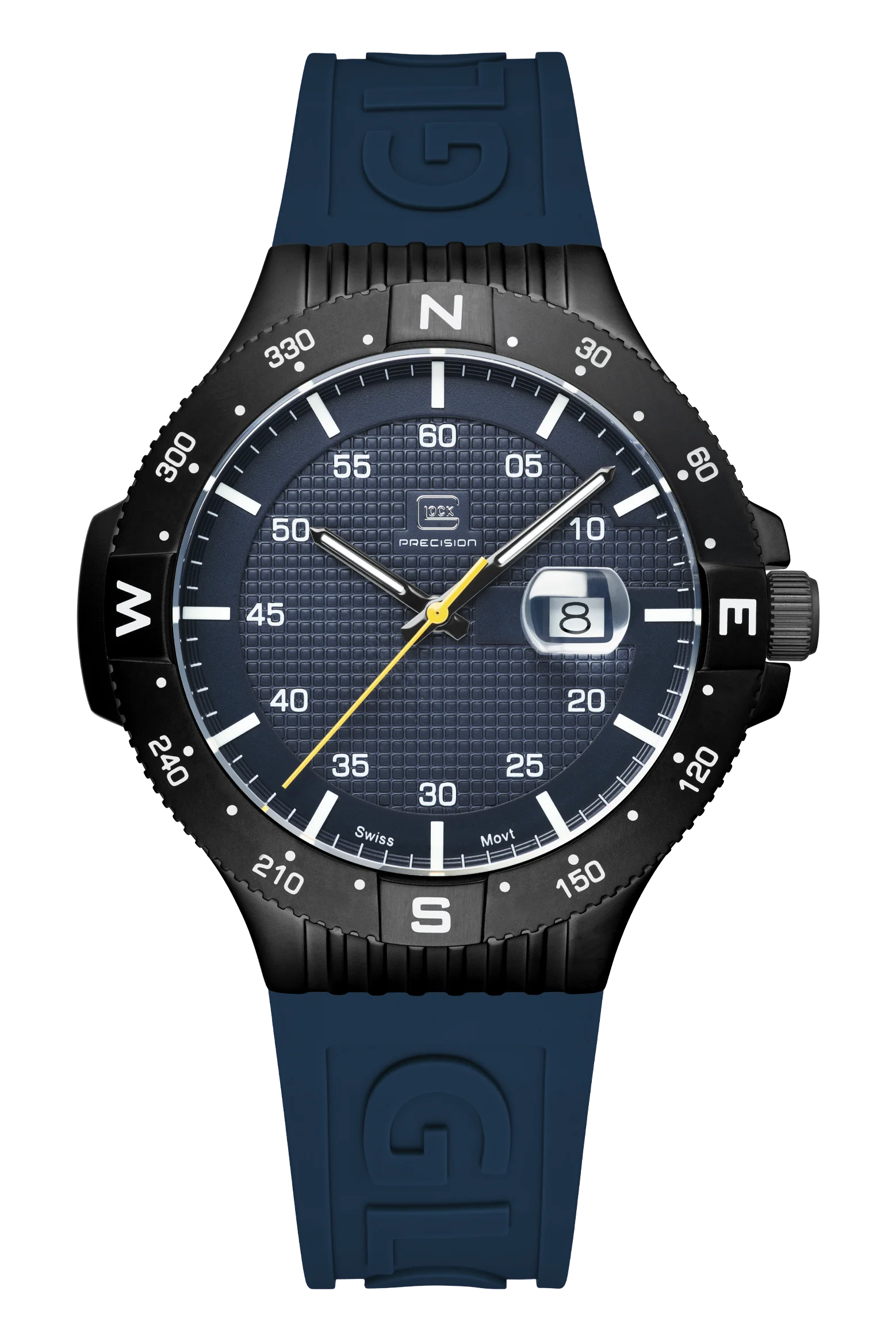 Encased in a gunmetal sandblasted stainless steel housing, the blue dial features hands and indices with Swiss Super-LumiNova® and a striking yellow second hand. A blue silicone strap with GLOCK lettering encircles the wrist, creating an athletic look. Powered by a Swiss movement and rated to 20 ATM water resistance, this watch represents durability and resilience.