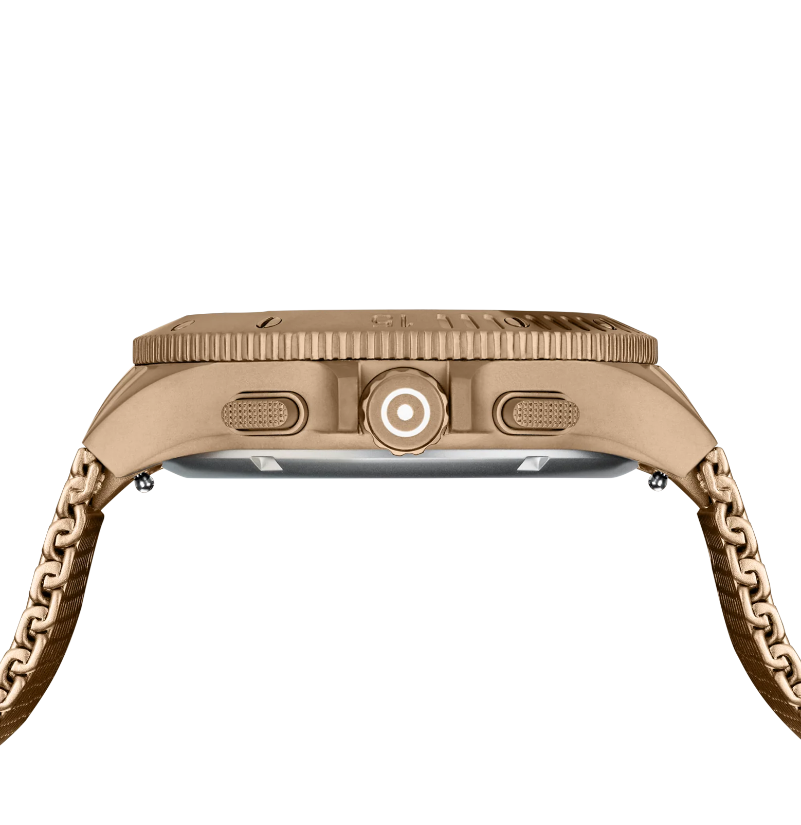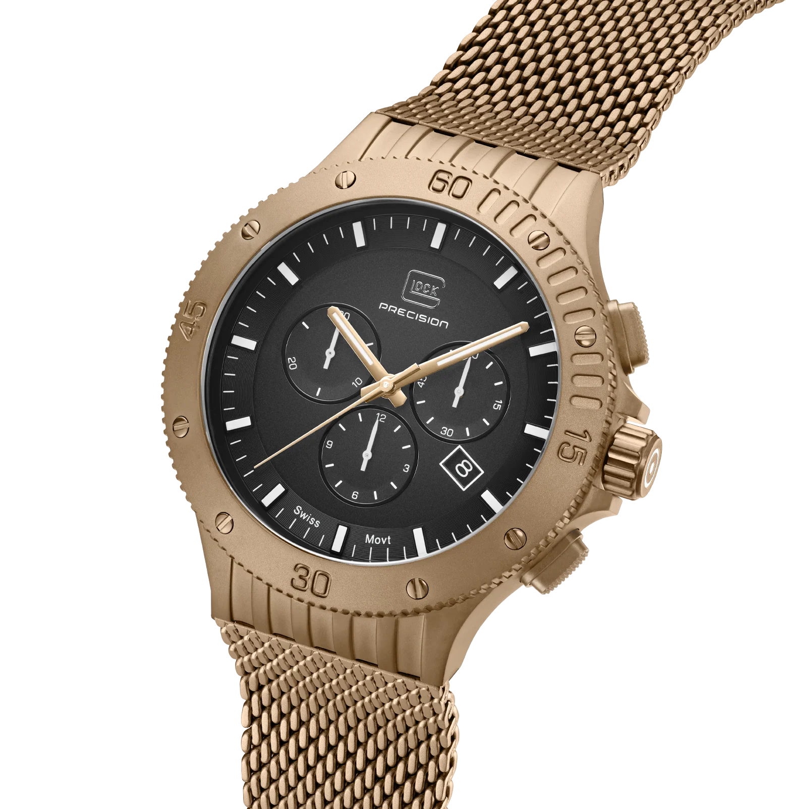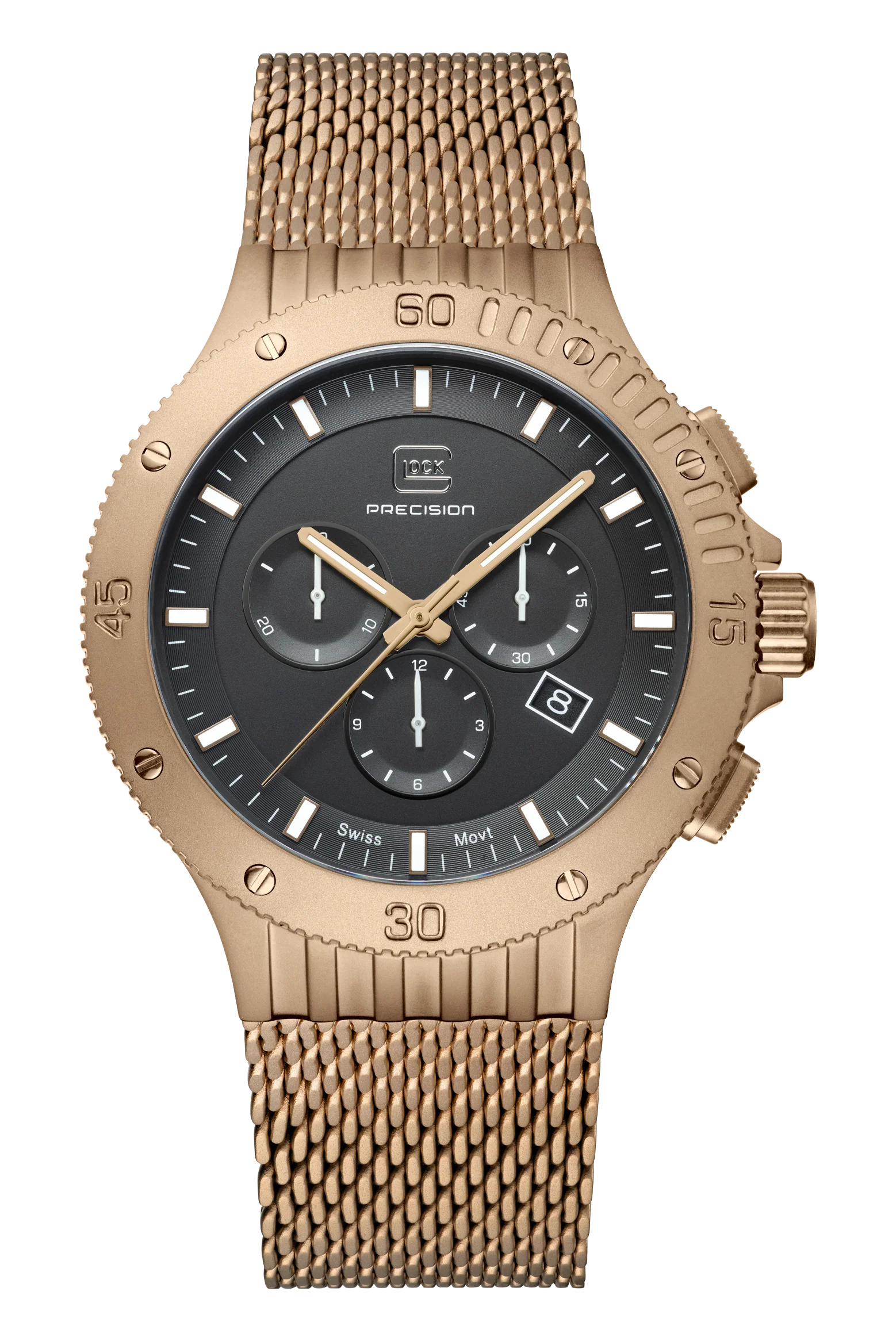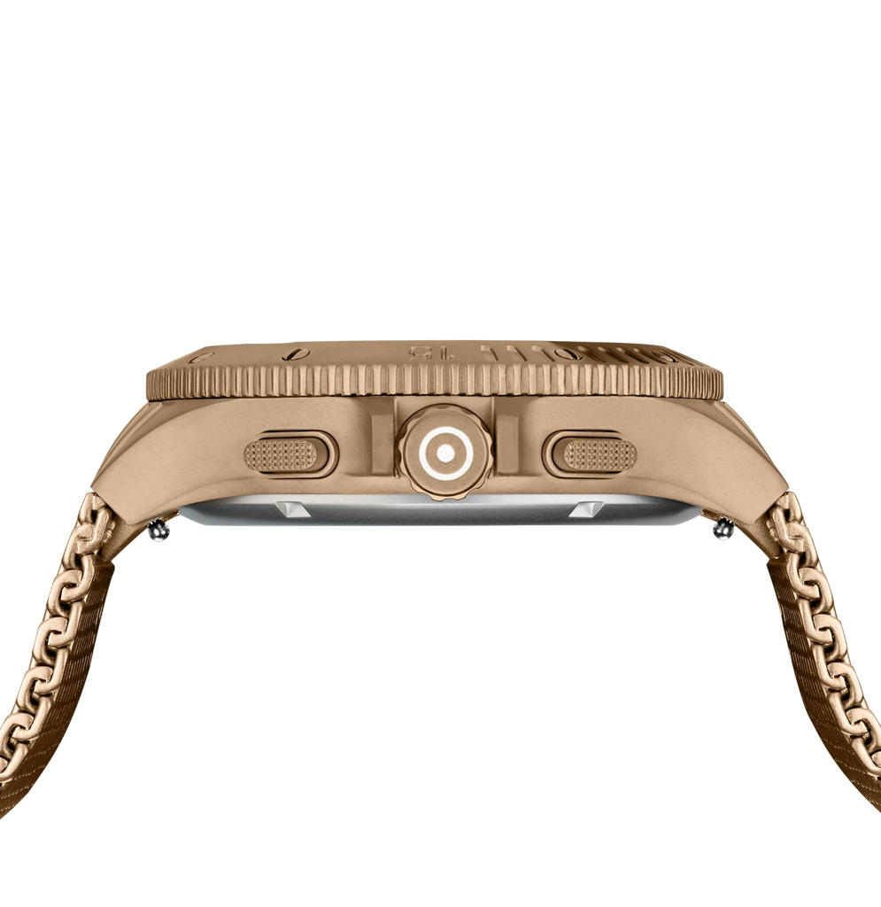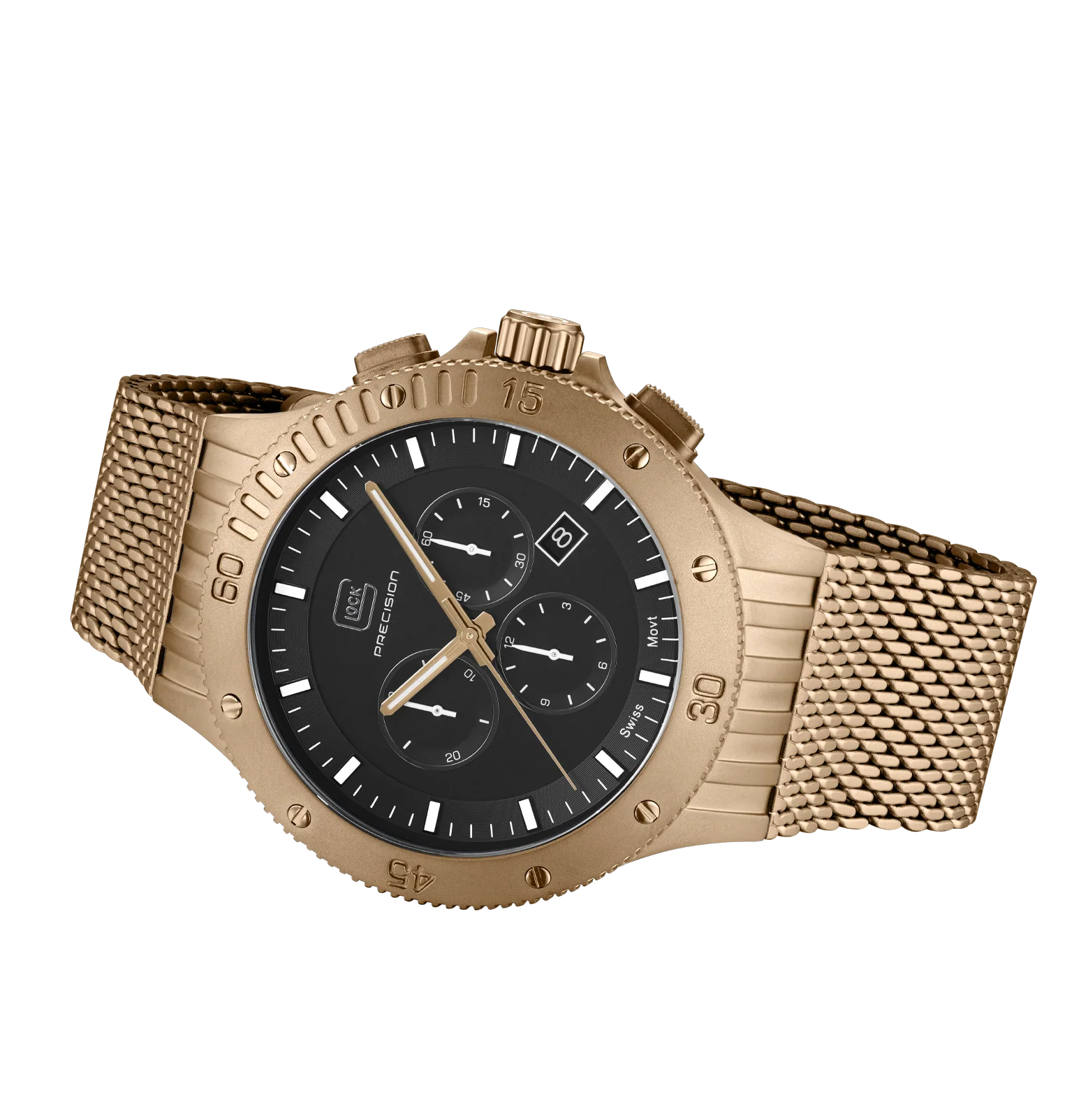This watch unites craftsmanship and timeless elegance. The coyote-tone stainless steel case matches the color-coordinated mesh strap. The black dial, illuminated by hands and indices with Swiss Super-LumiNova® and protected by sapphire crystal, operates with the precision of a reliable Swiss movement. With a 20 ATM water-resistance rating and a chronograph, it combines functionality and style.