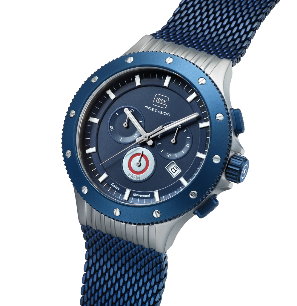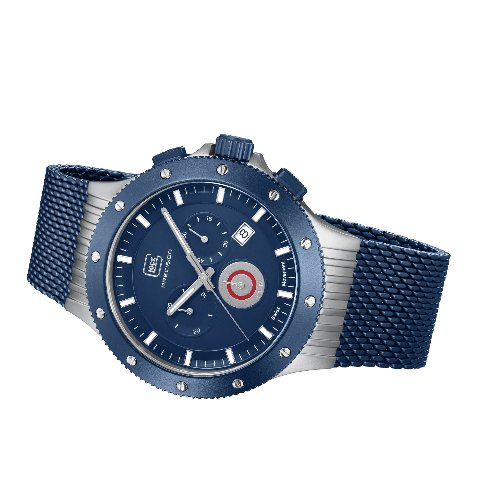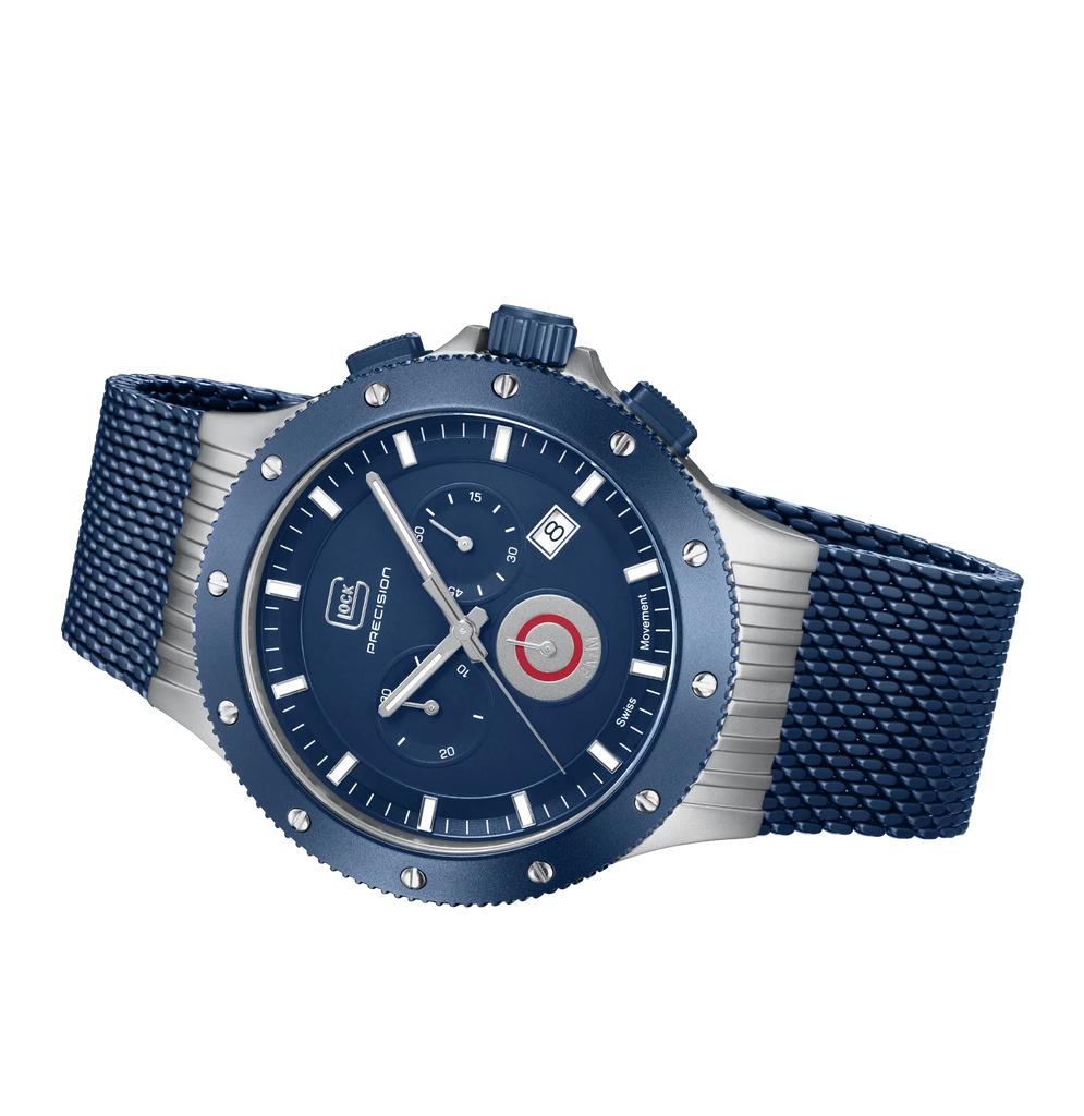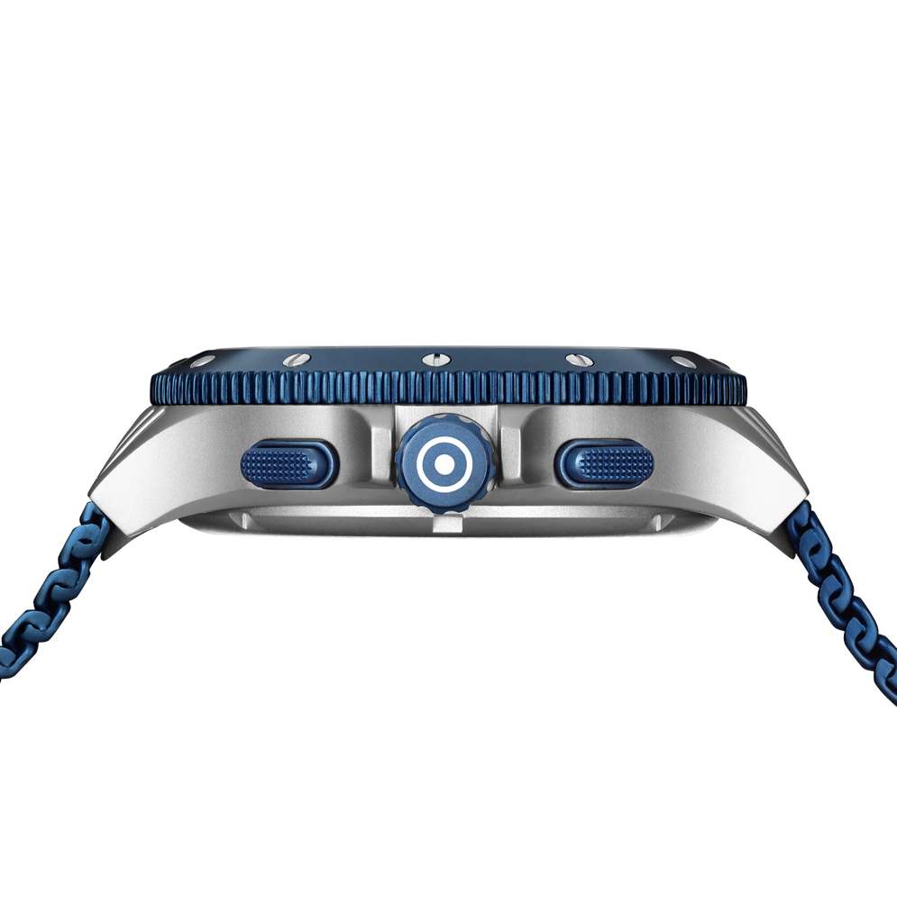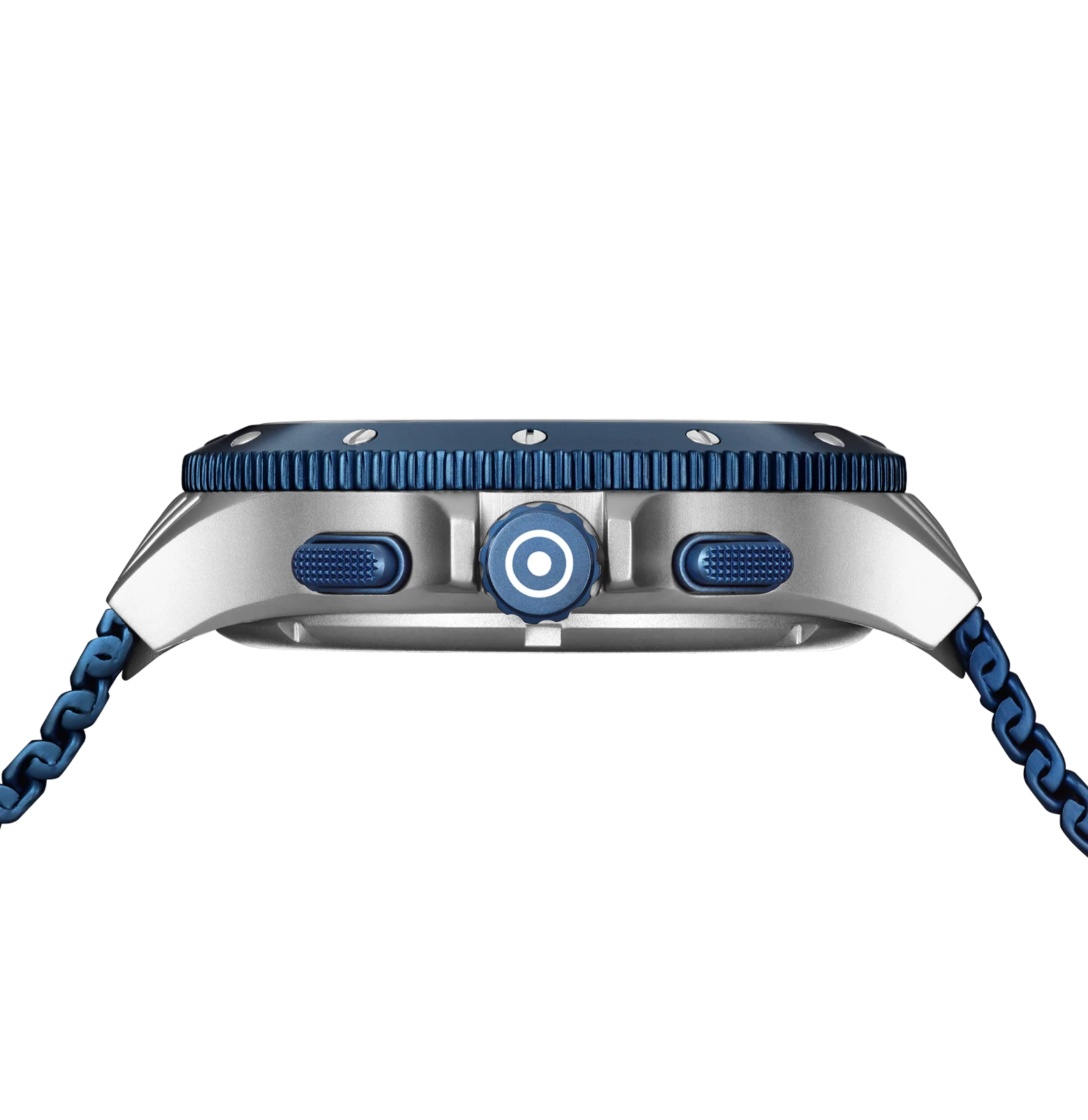 Its silver-tone titanium case is enriched by the distinctive detail of a bullet casing on the dial and features a blue bezel. Hands and indices with Swiss Super-LumiNova® ensure readability of the time even in low-light conditions. The watch is powered by a reliable Swiss movement, features a chronograph function, and boasts a water-resistance rating of 20 ATM.