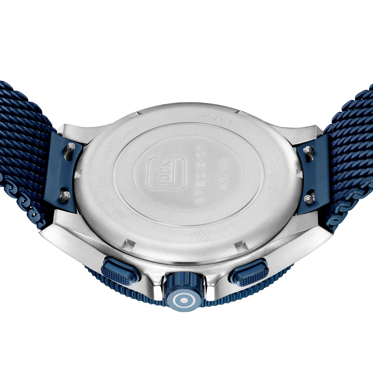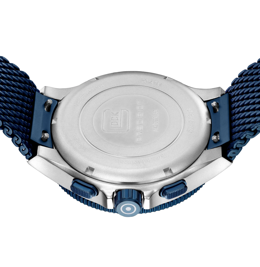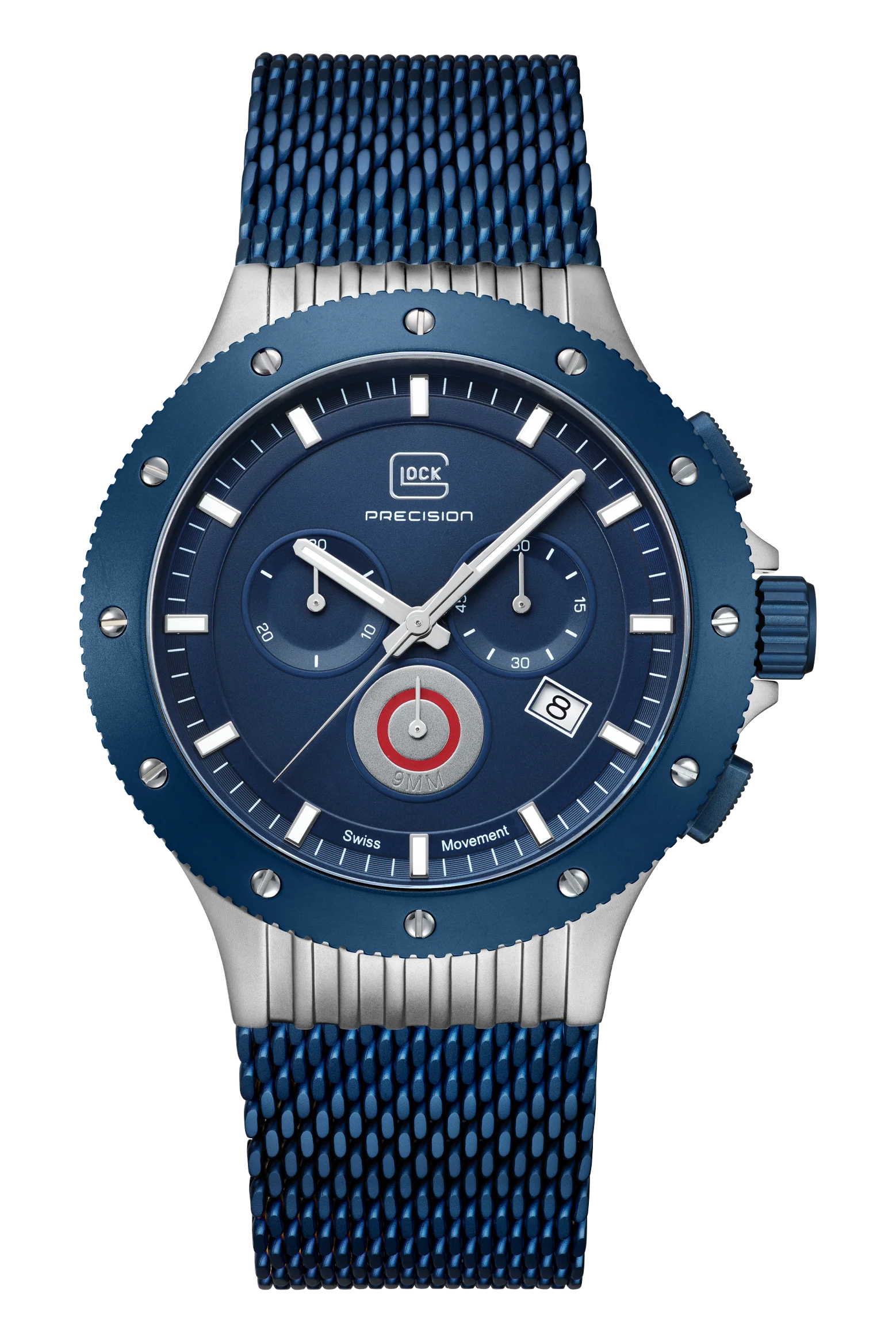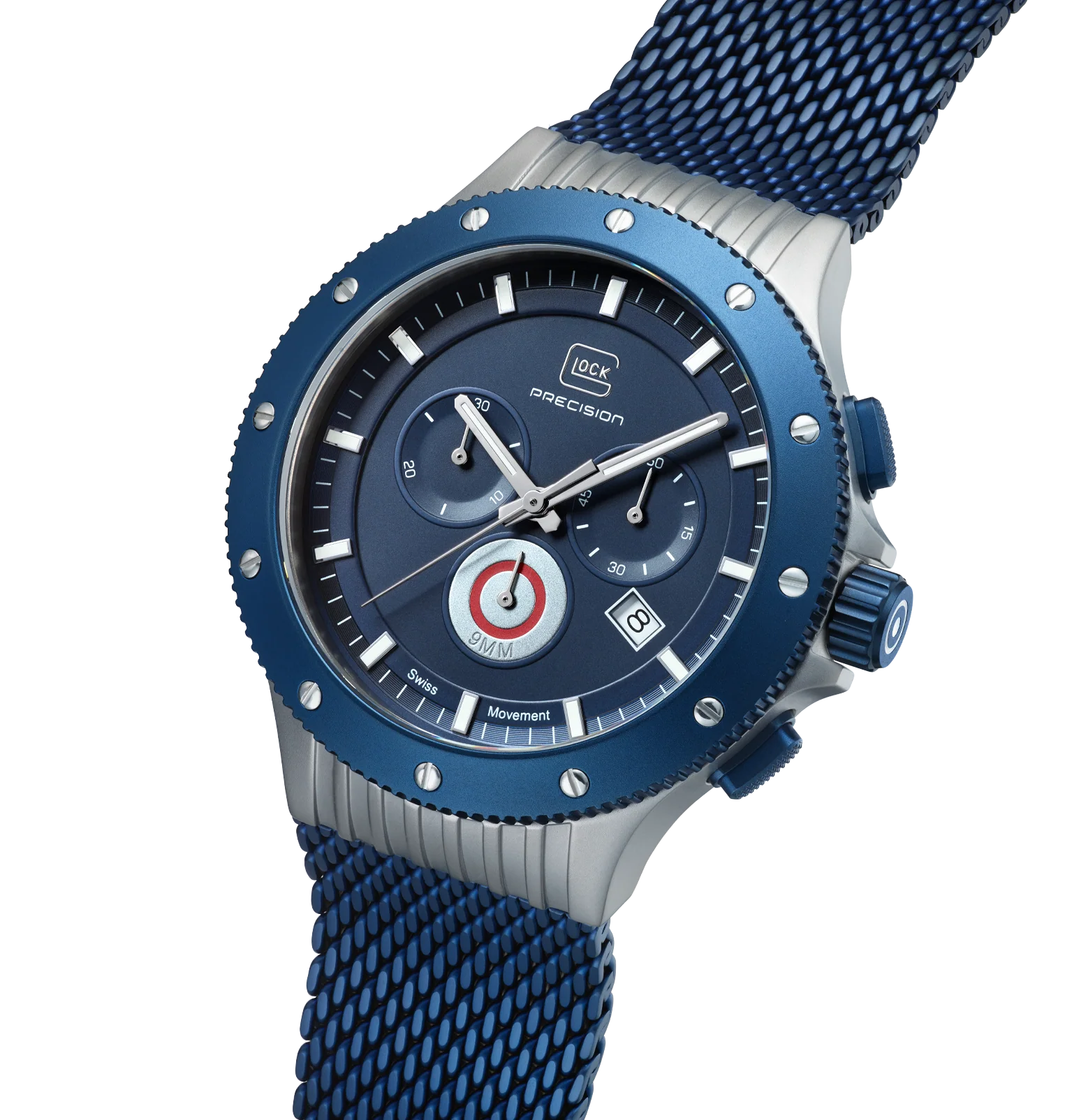 Its silver-tone titanium case is enriched by the distinctive detail of a bullet casing on the dial and features a blue bezel. Hands and indices with Swiss Super-LumiNova® ensure readability of the time even in low-light conditions. The watch is powered by a reliable Swiss movement, features a chronograph function, and boasts a water-resistance rating of 20 ATM.
