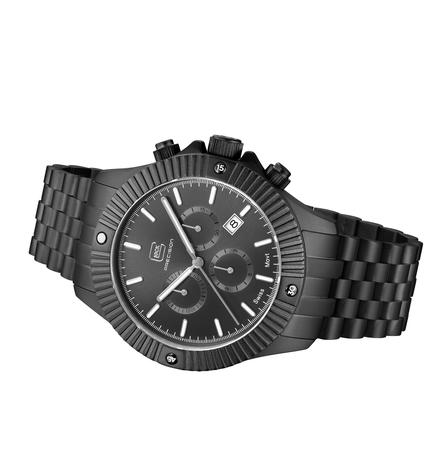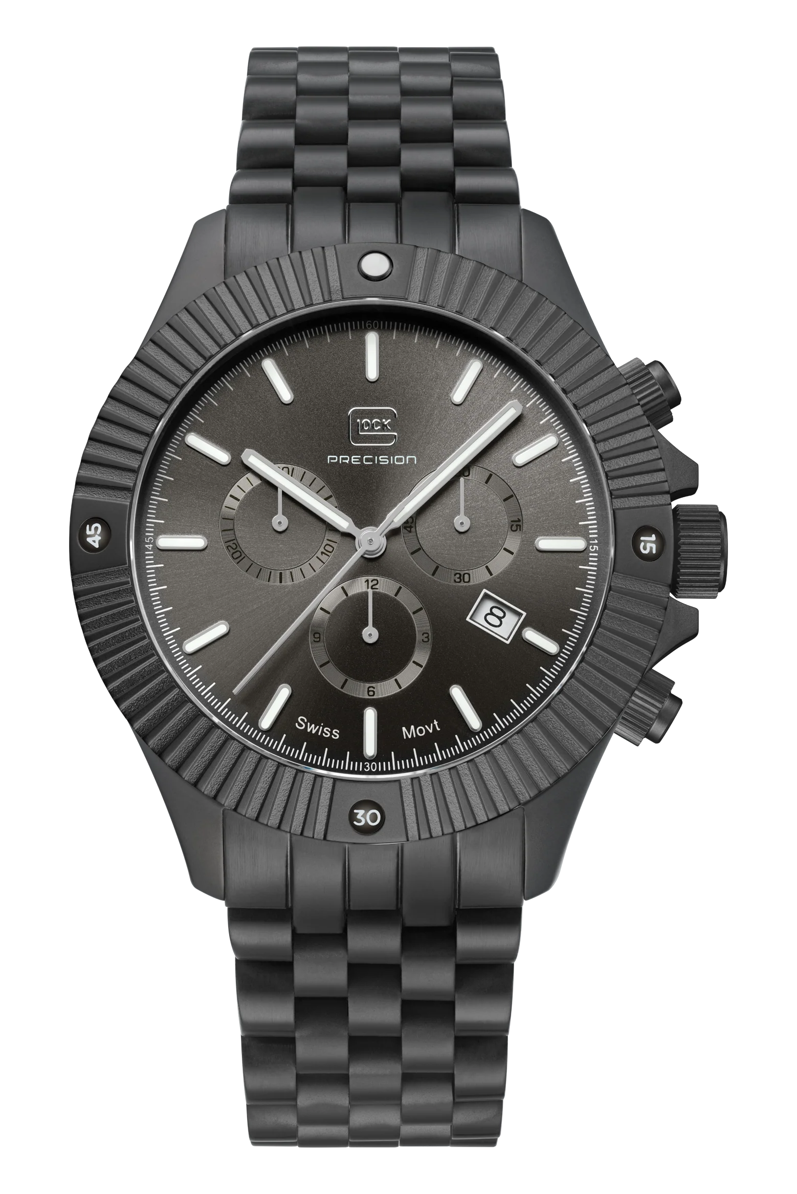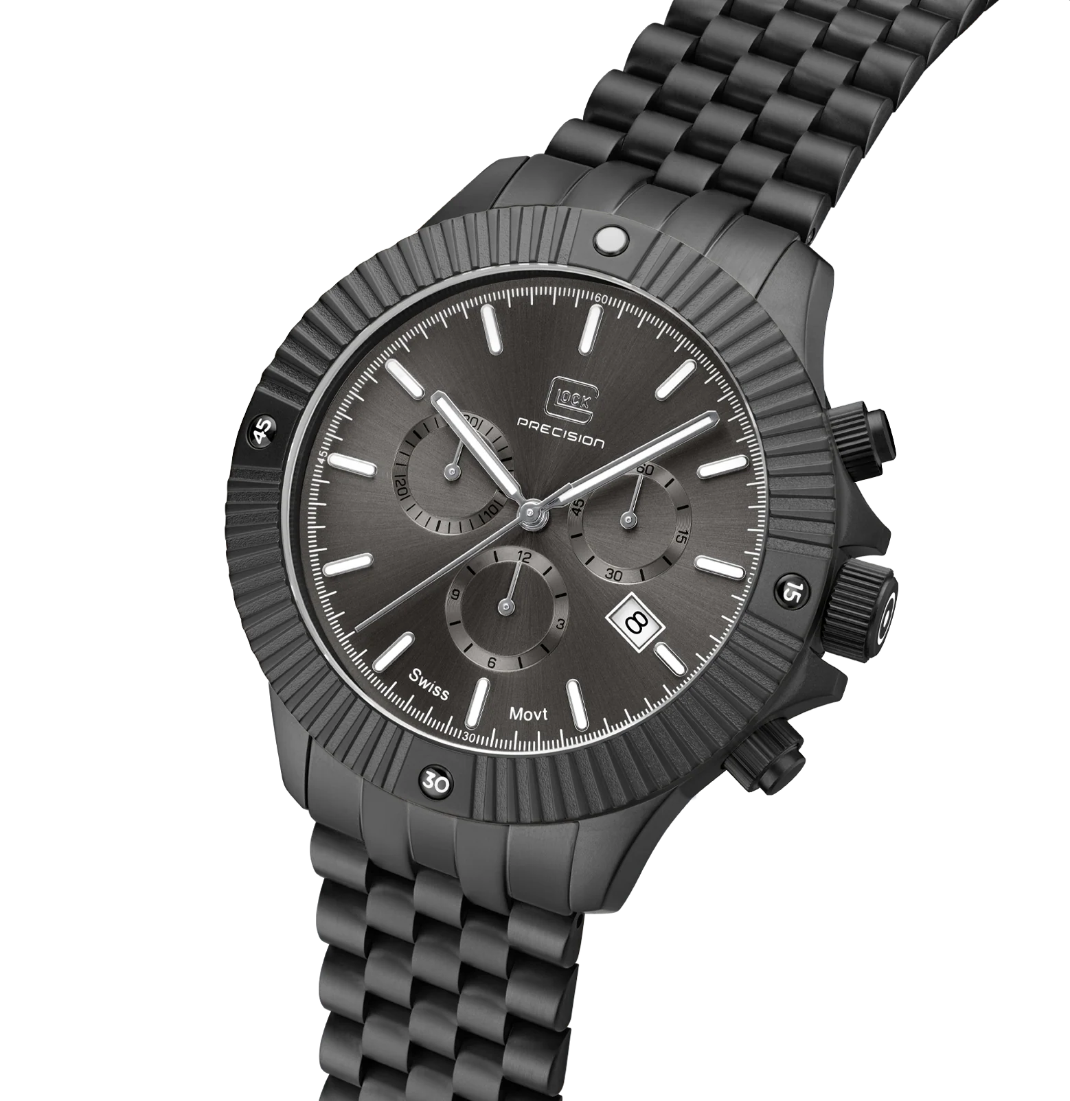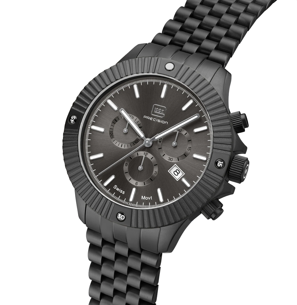 Modern aesthetics meet precision and accuracy. The elegant stainless steel case in gunmetal surrounds the color-coordinated dial, protected by scratch-resistant sapphire crystal. The gunmetal stainless steel link strap fits seamlessly into this color scheme. Inside, a Swiss movement ensures lasting precision. Equipped with hands and indices featuring Swiss Super-LumiNova®, a 20 ATM water-resistance rating, and a practical chronograph function, this watch combines functionality and style.